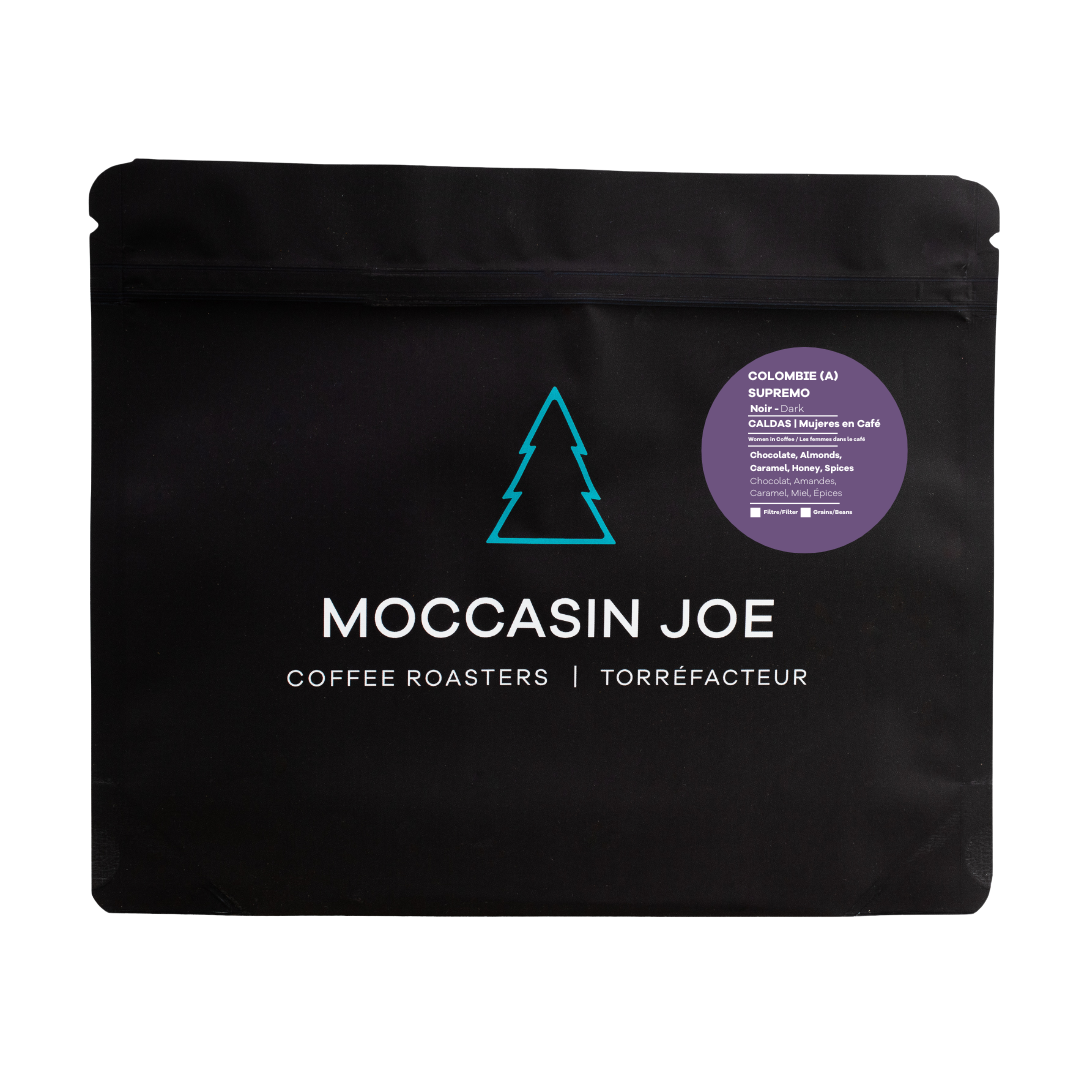 Rich and full-bodied, this Colombian Supremo is grown in the highlands of Caldas by women coffee producers committed to quality and sustainability. Roasted dark to bring out deep notes of chocolate, almonds, caramel, and honey, with a touch of spice in the finish.
